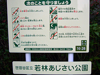 若林4-14広場から50mほど先、世田谷線の踏切手前の角地に、緑いっぱいの素敵な公園、世田谷区立若林あじさい公園がある。
