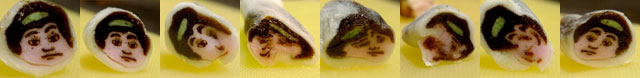 等間隔で切って順々に並べてみた。中には顔なのかなんなのか分からないものがありつつも、 どこを切っても同じといわれた金太郎飴に一定のバリエーションが出せてる。表情の善し悪しは別として。