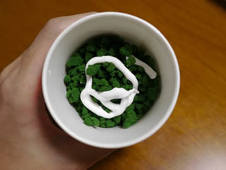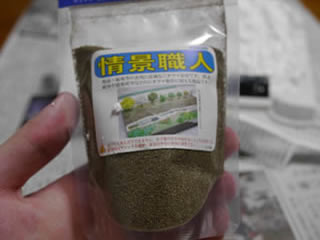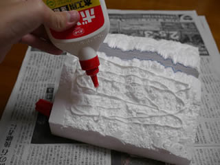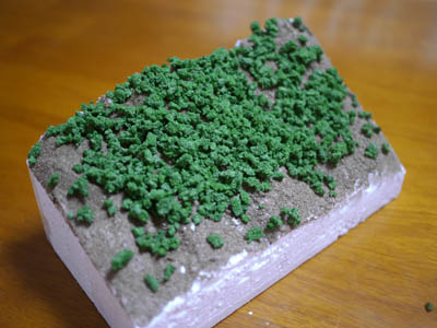 数時間ボンドを乾かしたら、草を植える。もろもろとしたスポンジにボンドと水を混ぜて発泡スチロールにのせるだけらしい。