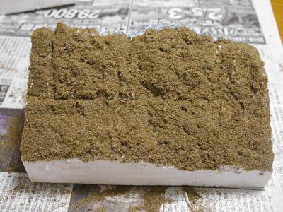 ボンドをたっぷりと塗って、「情景職人」というジオラマの地面を再現する粉を降りかけると荒れた山のようになった。
