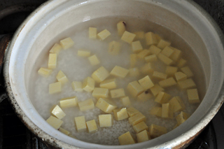 炊きたての芋ご飯、全体にいきわたった芋の甘い香りがたまらない。食べるとホクホク、甘さと風味が口中に広がる。それがご飯と一体となり素晴らしい美味しさを、幸せを感じられる。