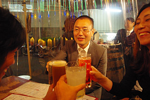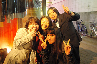 見ればさっき串カツ屋で別れた怪しい人、いや愉快な人とその仲間たちだ。イエーイ、カンパーイ。
