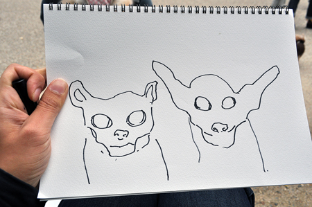 凄い勢いでまくし立てるおばちゃん。チワワ2匹とミニチュアピンシャーを一緒に描いて欲しい。との事。うむむ、これはハードルが高そうだ、頑張らねば。