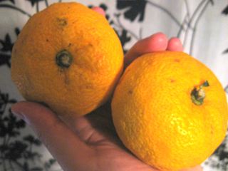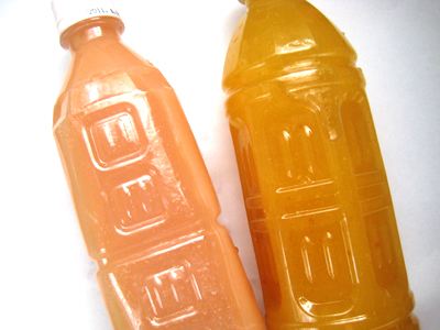 | 左が新しょうが、右がゆず。とりあえずペットボトルに詰めたけど、本番はきちんと瓶を用意したいところだ…(でも瓶って、今時、100均でも売ってないのよねえ) |