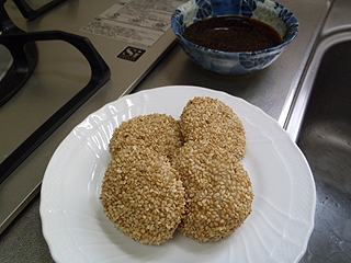 胡麻大福を生姜炒めにします。チョコやアイスは加熱すると溶けてしまうので、炒められるお菓子は限られてきます。スナック菓子類も炒められますが、ソースや醤油や塩味の物がほとんどなので、あまり変化がないでしょう。結果餡子物となりました。