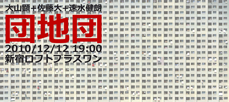 ■団地団夜 vol.1 団地トーク 〜団地妻もあるよ〜 【日時】2010年12月12日(日) OPEN18:00/START19:00 【場所】新宿ロフトプラスワン 【出演】団地団(大山顕、佐藤大、速水健朗) 【料金】前売¥2000(飲食別)当日未定 前売はローソンチケットにて【L:34654】