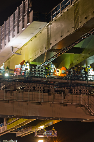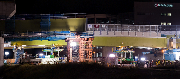 今回の工事は2種類あって、ひとつは上の写真たちのように、桁を滑らせていって、所定の位置におさめるという工事。