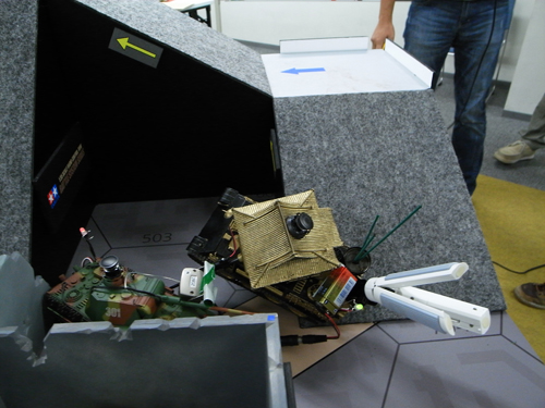 上り坂に挑もうとしたその時、車載カメラがはずれ、その衝撃で砲台が外れました。