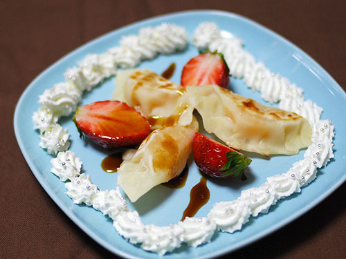お菓子作りって(これお菓子なのかわからないけど)楽しいんですね。好きな餃子だから食指がわくし、数人を集めて「餃子の形してるけどスイーツだから安心して」と半ば強制的にふるまったところ、おおむね好評だったというのがまたいい気にさせる。