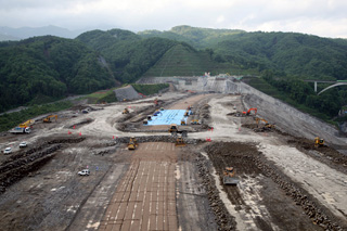 ところで、なぜコンクリートではなく土や岩でダムを造るのか。実はそれが岩盤の強弱に関係している。コンクリートダムを造れないほど岩盤が弱い場所にダムを造る場合、たいていロックフィルダムが選択される。なぜなら、ロックフィルダムは岩山が崩れないようになだらかに造るので、体積が大きくなり、底面積も大きくなる。したがって、水圧をより広い範囲で抵抗することになるので、ひとつひとつの場所ではかかる力が弱くて済むのだ。