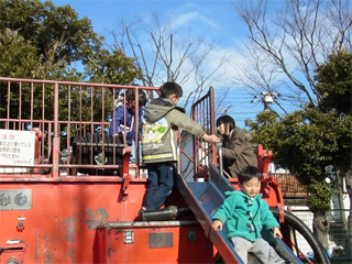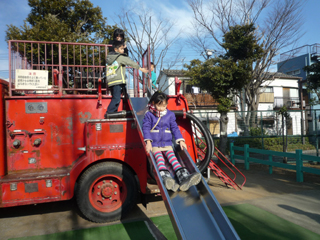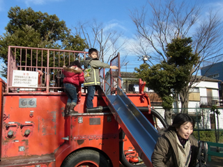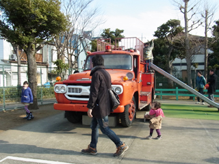 公園入り口近くにあった古い消防車もけっこう人気があった。ふーちゃんはあまり運転席に興味は無かったらしくさっさと上へいく階段を登った。私もついていく。