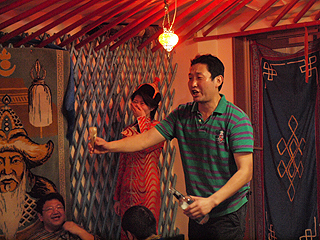 モンゴルの歌と酒に続いてはモンゴル相撲が行われます。実は、私は店長へのインタビューという名目もありましたが、早めに店に行って店長から秘密の衣装を借りていました。普通のモンゴル衣装の下に着ていたのがそれ。