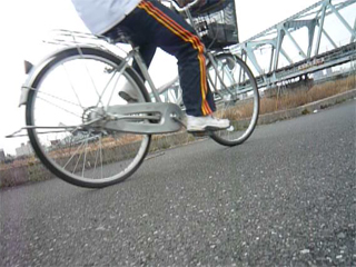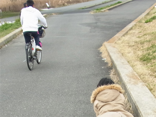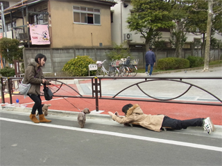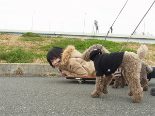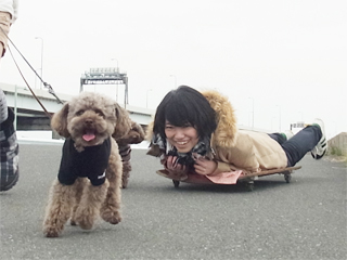 犬達を画面に入れようとよそ見をしながら走った為、途中で縁石に当たりそうになってしまった。「うわ〜!」と情け無い声を出しながら(ほんとに情け無いので音消してます)方向転換をしたら、今度は危うく自転車にひかれそうになる始末。