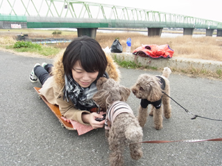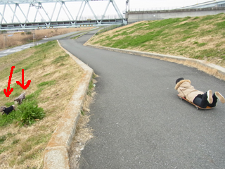 土手には公園に無いものがあった。坂だ。 寝板に乗ってこの坂を下れば、あたかも犬がキャッキャと走っていくのを体感できるのでは無いだろうか。