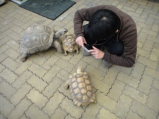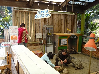 建物の外のにぎやかな様子が気になって、ガラス越しに覗いてみる。親子連れが楽しそうに亀とふれあっているではないか。ただ、よく見るとそれだけではない。