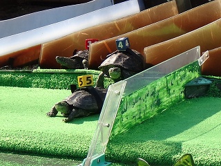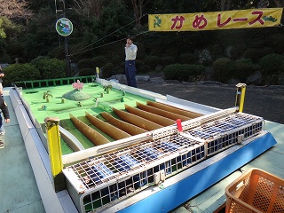 続いては一日数回行われる「かめレース」。10匹いる亀の中から、最初にゴールへ到着する亀を予想するゲームだ。