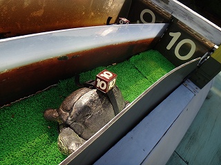 まずはスタートのカゴの中の亀を観察する。しばらく見た結果、一番モゾモゾと動いていてやる気のありそうな10番の亀を選ぶことにした。的中すると景品をもらえるらしい。