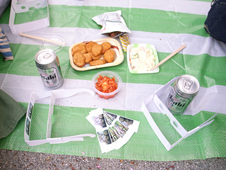 担当・石川氏、橋田さんを誘い、ニフティ近くの桜の名所にやってきた。当然桜はほとんど散っていた。だがそんなこととは関係なく、持参のレジャーシートを桜の木の下に敷き、ビールとつまみを並べた。 |
