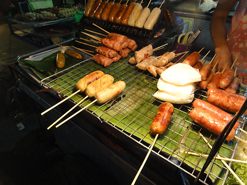 翌日、別のナイトマーケット(かただの歩道)を歩いているとソーセージを発見。これまでの魚肉ソーセージでもないし、ごはんつぶが入っているソーセージでもない様子。