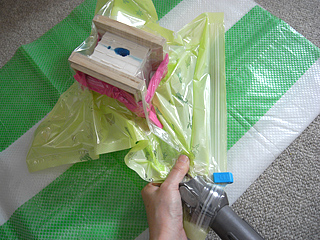 ・・・やはり、そうか。この透明キャストというやつは、気泡が入りやすく、それを取り除くのが非常に難しい代物なんである。ふとん圧縮袋方式で、数分、掃除機をかけて泡を除こうとしたがダメ。