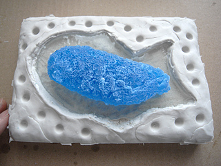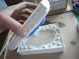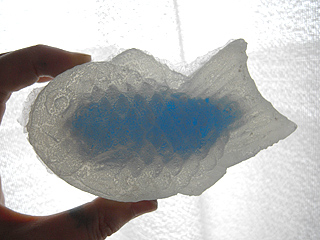 まず薄くキャストを流し、固まったら上に餡子を置き、また周囲にキャストを流して埋め、固まったらもう半面に流したキャストに押し付けるという、かえって本物の鯛焼きを焼くかのような対策をとった。