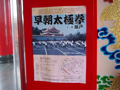 「毎週末に『早朝太極拳』てのをやってるんですよ。参加する手続きとかはないので初心者でも手軽に参加できます」