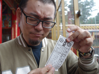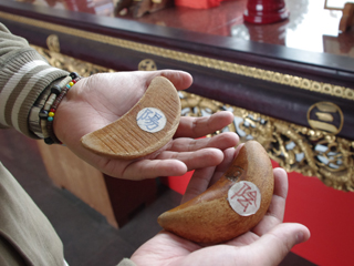 陰陽の形をした木製のブロック(神杯)を投げて、その裏表でその数字が正しいか、もう一回引き直しかを確認するところが日本と違う。ひと手間、ふた手間が台湾はしっかりしてますね。