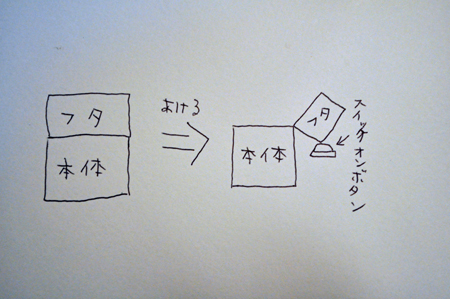 頭の中にある設計図を紙に書いてみた。書いてはみたが、スイッチオンボタンが一体何で、どうやって電源を入れるのかは分からない。とりあえず東急ハンズに行ってみよう。
