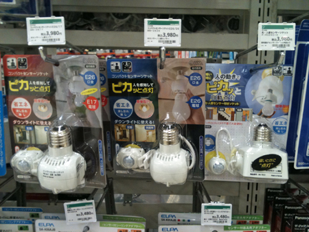 東急ハンズを離れ、ホームセンターコーナンにやってきた。あるかなぁ、と思って見てみると、いっぱいあった、がっさがっさと有って、しかも安い!明るい時も反応する!これだ!と、買って帰った。