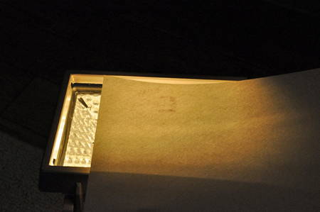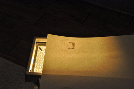 試しに描いた絵をライトに当ててみるとしっかりと消えた。150ワットの電球を使っているので予想以上に明るくて、熱い。凄く良いぞ!