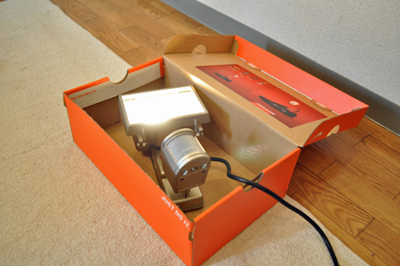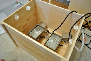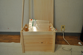 箱と材料を買ってきて、中に照明を入れてみると二つ入れてちょうど良い位の大きさだった、よしよし。後は、このままじゃ子供のおもちゃ入れみたいだから、加工をしよう。