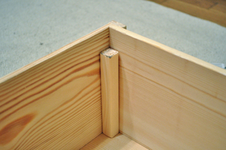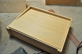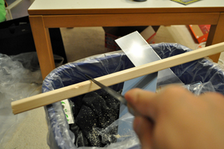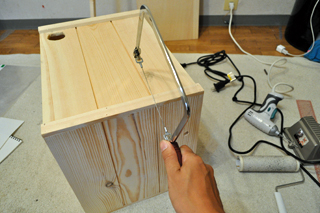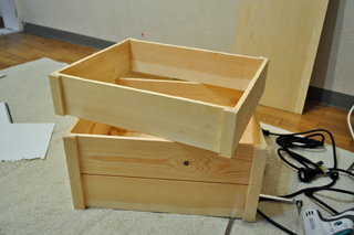 まずは箱を切る。ガリガリガリと箱を切る。部屋の中に木クズが舞う。今まで色々作ってきたが、下に何か敷いたり、ちょっと外に出たりしてみても、結局敷いたものからはみ出したり、部屋の中でやり出しちゃう。