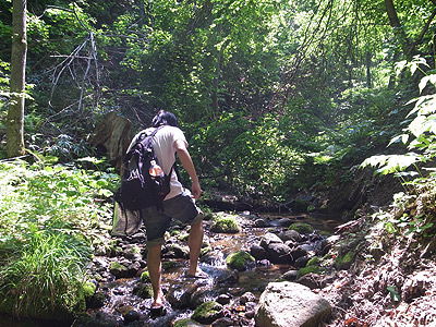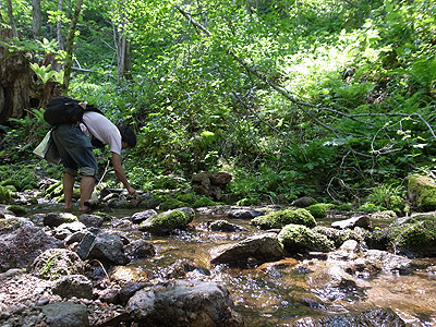 沢の水は冷たい。 ニホンザリガニがいそうな雰囲気でいっぱいだ。その代わりに道もないので、沢の中を歩くしかない。静かな山の中に僕の作った熊よけ鈴とセミの鳴き声と悲鳴だけが響く。