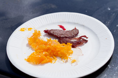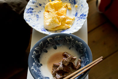 白身が大量に流れていってしまったのでこんなに黄色いのか。 玉子も肉も、焼けたというより乾いたと言ったほうが良さそうだ。 炎天下に肉を放置しておけばビーフジャーキーっぽいものができあがる。