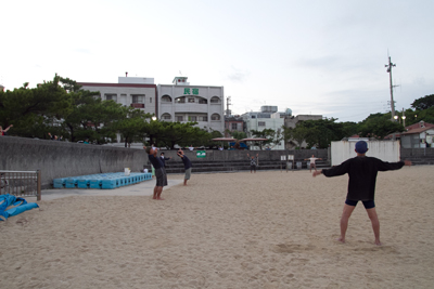 なんと気持ちの良い一体感でしょうか。 公園にいた人が集まって来て、全員ビーチを丸く囲み体操をしています。