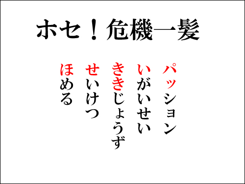 固い標語を作っていると一同の肩もこる。「すこし柔らかいものも作ってはどうか」林の提案から生み出されたのが、この「ホセ!危機一髪」である。