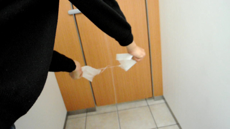 うおお、切れる。ペーパータオルが切れていく。そりゃあ切れるわという勢い。刃物とかのようなスパっと切れる感じではなく、細い物で強く叩かれたような感じで切れていく。