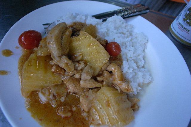 レッドカレーのように見えるがまったく辛くない食べ物。スパイスがたくさん使われていて厚みのある美味しさである。夢中で食べた。あとからやってきたタイのお坊さんもこれを注文していたので、きっと人気メニューなんだと思う。