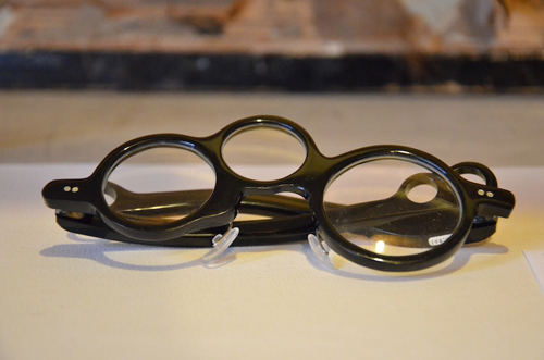 スピードメーター、タコメーター、フユーエルメーターをイメージした車好きにはたまらないアシンメトリーなめがね。