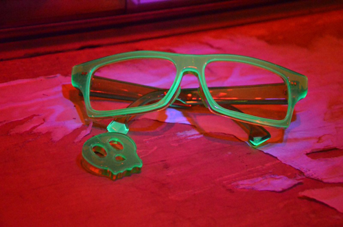 ブラックライトに反応し発色する特殊な生地で作られためがね。
