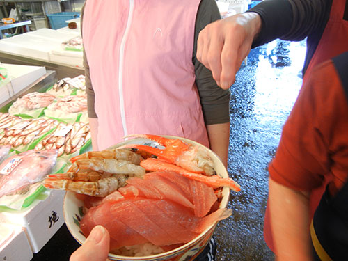 できたーー!!そうなると、別の店のおばさん達が「見せて見せて!」と集まってくる。そして「なにか足りない…」という話に。