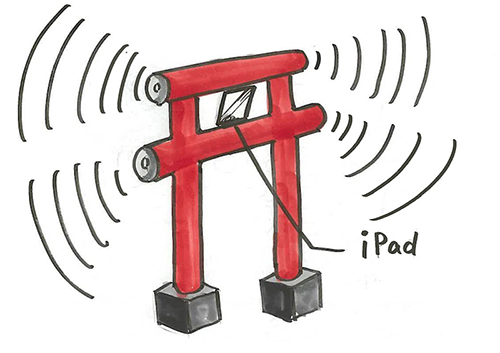 鳥居についている額の変わりにiPadを設置すれば、ituneとスピーカーをつなげることもできる。