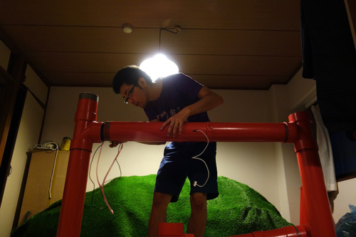 塩ビパイプに穴をあけ、コードを通していく。