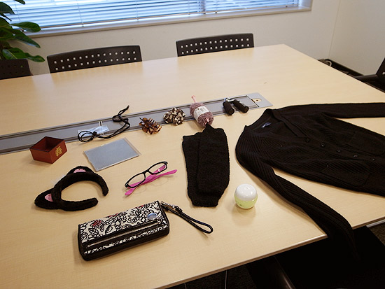 お化粧も終わり彩里ちゃんはほぼ女性社員になったけれど、アイテムを追加した方がより女性社員になるだろうということで、安藤さんと僕とで事前に女性っぽいアイテムを準備しておいた。それらを机に並べ、彩里ちゃんに選んでもらう。