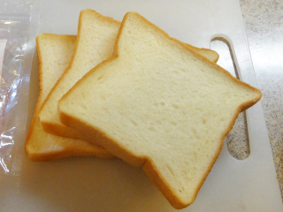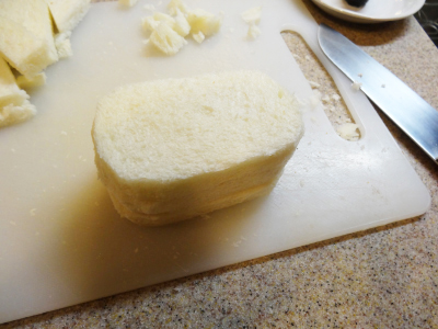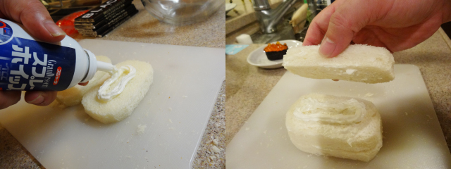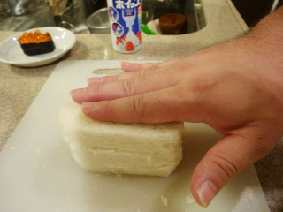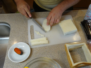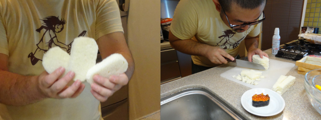 パン耳はとってしまって白いところだけ使います。 イクラの軍艦巻きと見比べながら慎重に形を俵型にしていきます。
