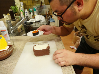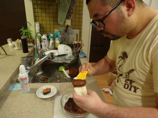 チョコレートが茶色すぎたのが悔やまれるが 全体的にいい感じにしあがってきた。 意外と神経を使うチョコレートコーティングの作業はまるで 伝統工芸品をつくる職人になった気分でした。 そして何より既においしそう。