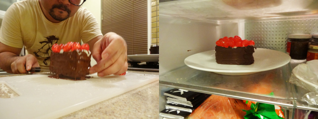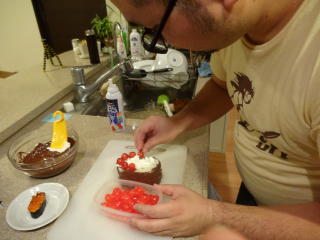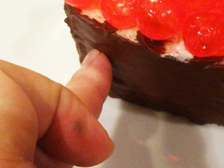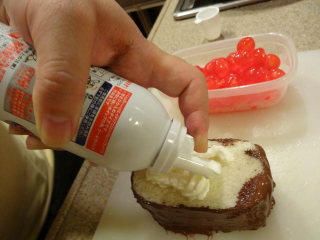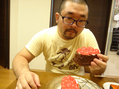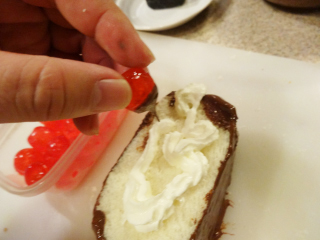 最終段階、トッピングターイム。 土台部分をしっかりつくってあるのでなんの心配もない。 あとはイクラちゃんこと、ドレンチェリーちゃんを乗せるだけ!