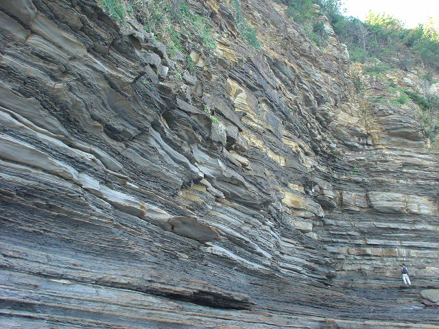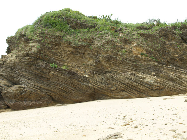沖縄の北部の東海岸は、結構いい地層がみれます。 これもなかなかいい褶曲じゃないかなーと。 沖縄だと、やっぱり底仁屋の横臥褶曲と行きたいところだったんですが、手元にあった写真がこれだけでしたので、ご勘弁を。