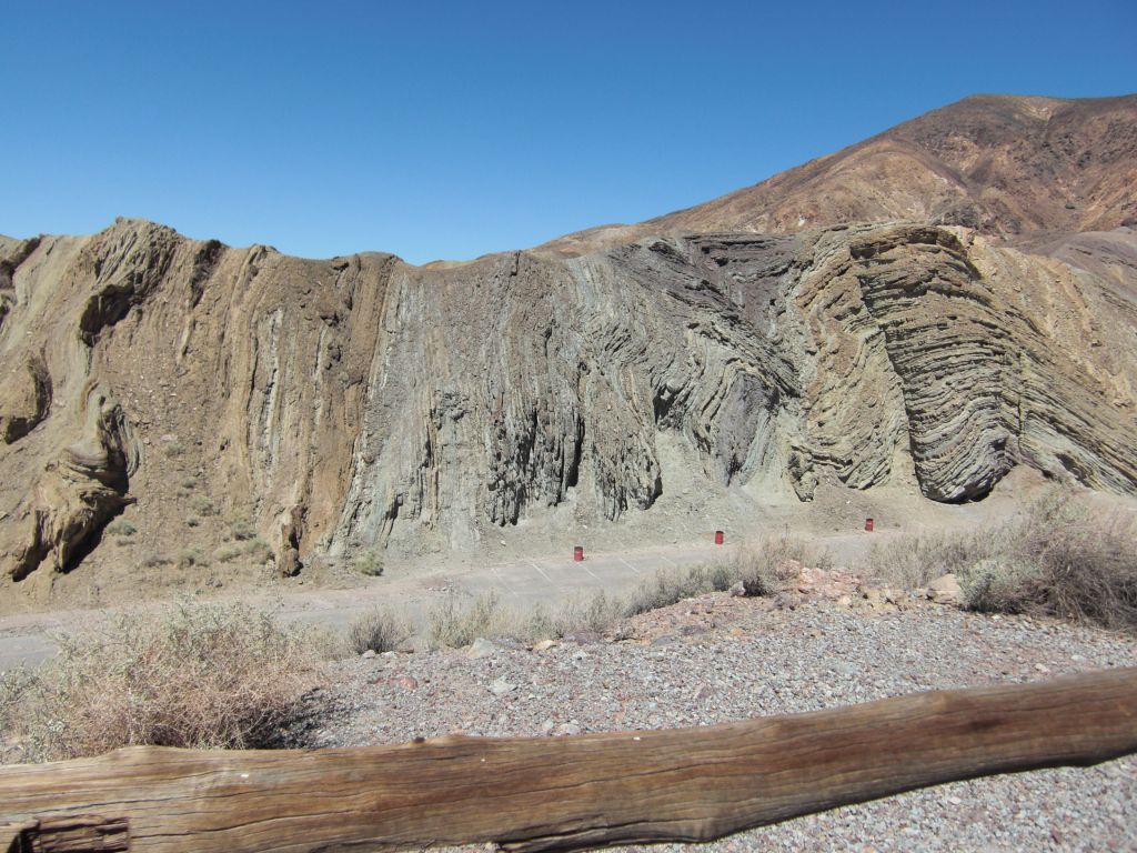カリフォルニアのバーストゥ近郊のキャリコ ゴーストタウン リージョナル パークの駐車場横の地層です 元鉱山だった所ですが このような地層だからこそ宝石なんかが生成されたんでしょうね
