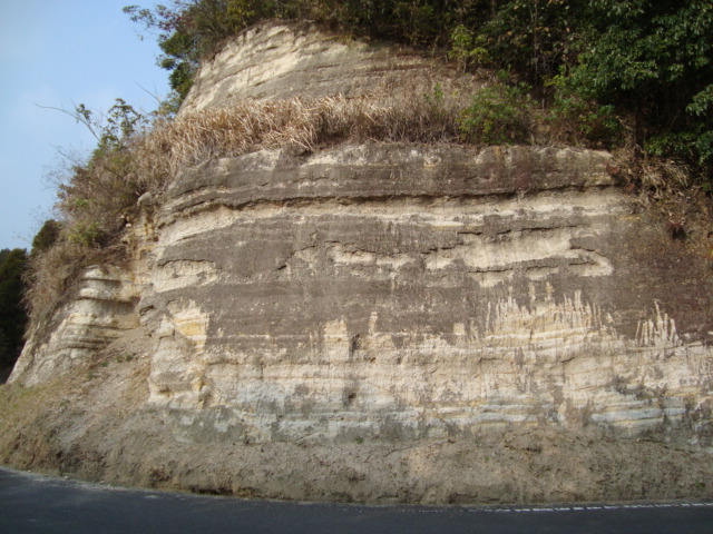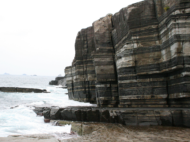 対馬の海岸沿いはだいたいこんなかんじの崖になっていて、地層がよく見えます。この地層がつもったのは数千万年前の海の底なのだそうです。残念ながら化石はぜんぜん出ません。